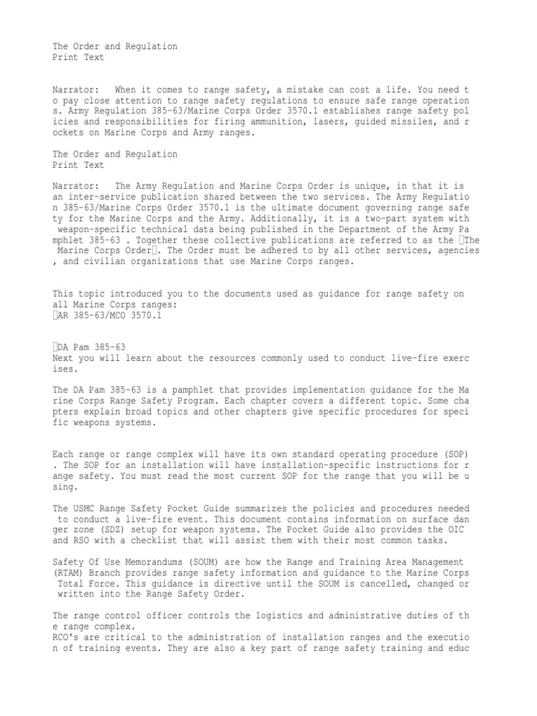 study with quizlet and memorize flashcards containing terms like which marine corps order governs range safety programs, what is one. read sop, local range regs, and local safety brief. this guidance is directive until the soum is cancelled, changed or written into the range safety order. Assign and brief arsos, corpsman, safety driver, and other support. identify range hazards, implement appropriate controls, and develop regulations and sops It covers the minimum range. establishes ranges safety policies and responsibilities for firing ammunition, lasers, guided, missiles, and rockets on marine.